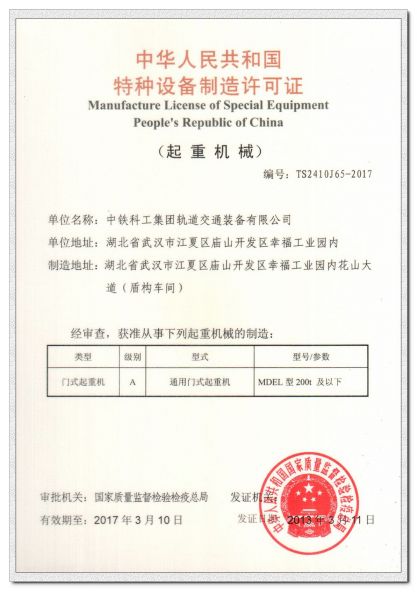 | 中华人民共和国特种设备制造许可证门式起重机A级 |
