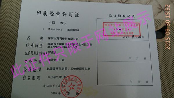 | 持证单位: 深圳市英利印刷有限公司 |